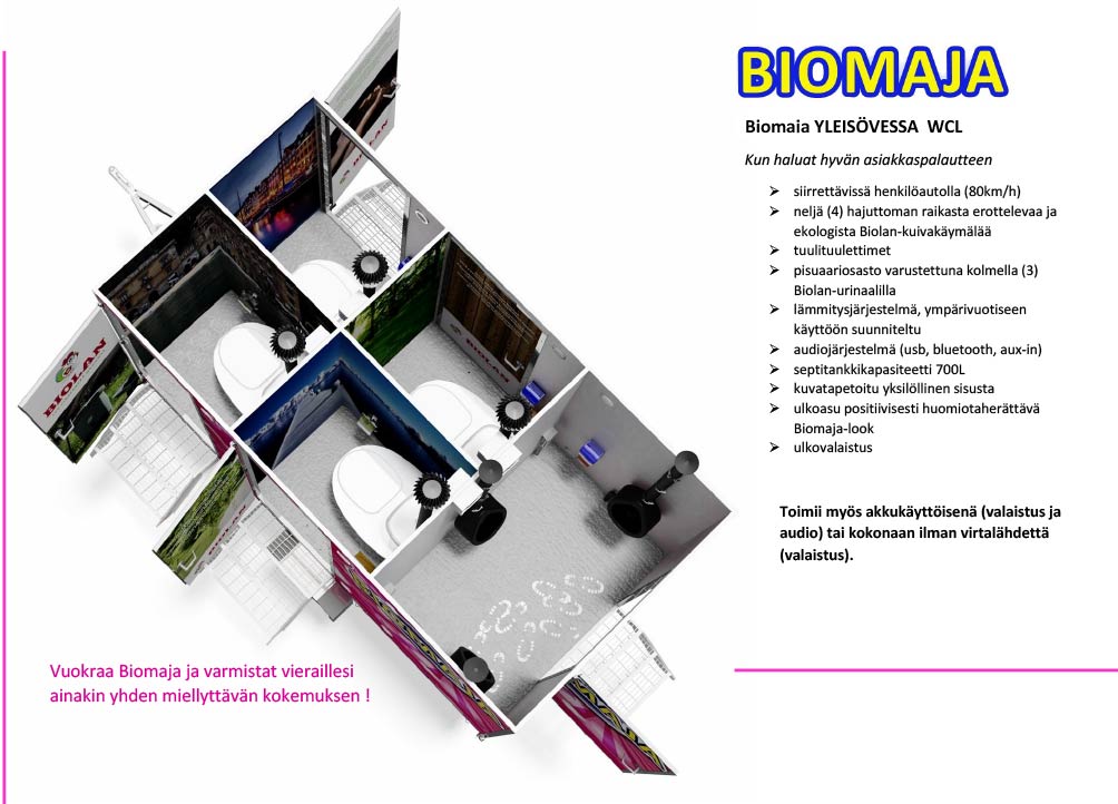 Biomaja-yleisövessa on siirrettävissä henkilöautolla ja sitä saa vetää 100km/h.